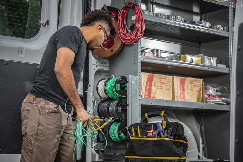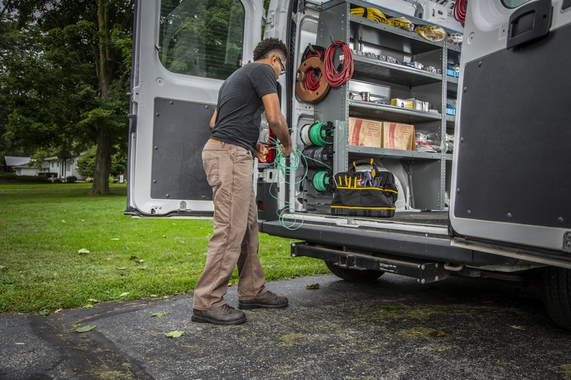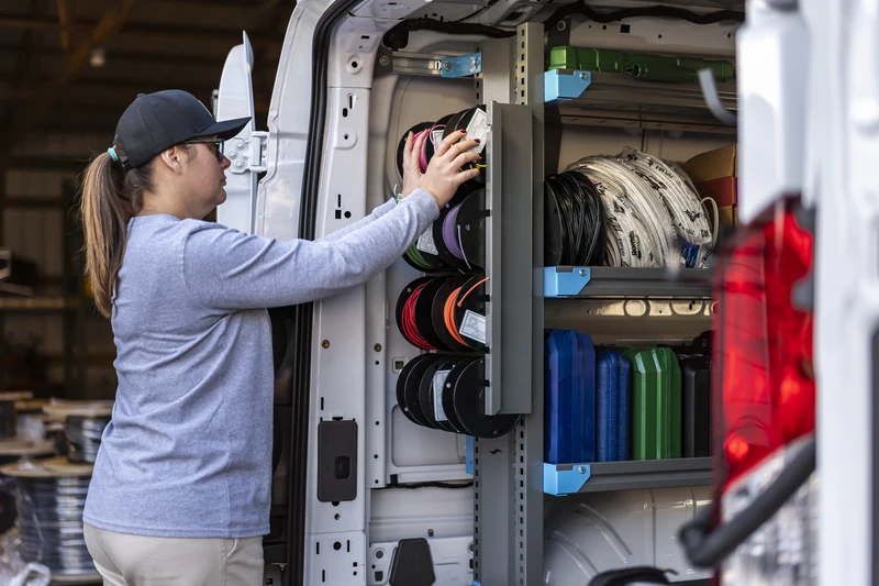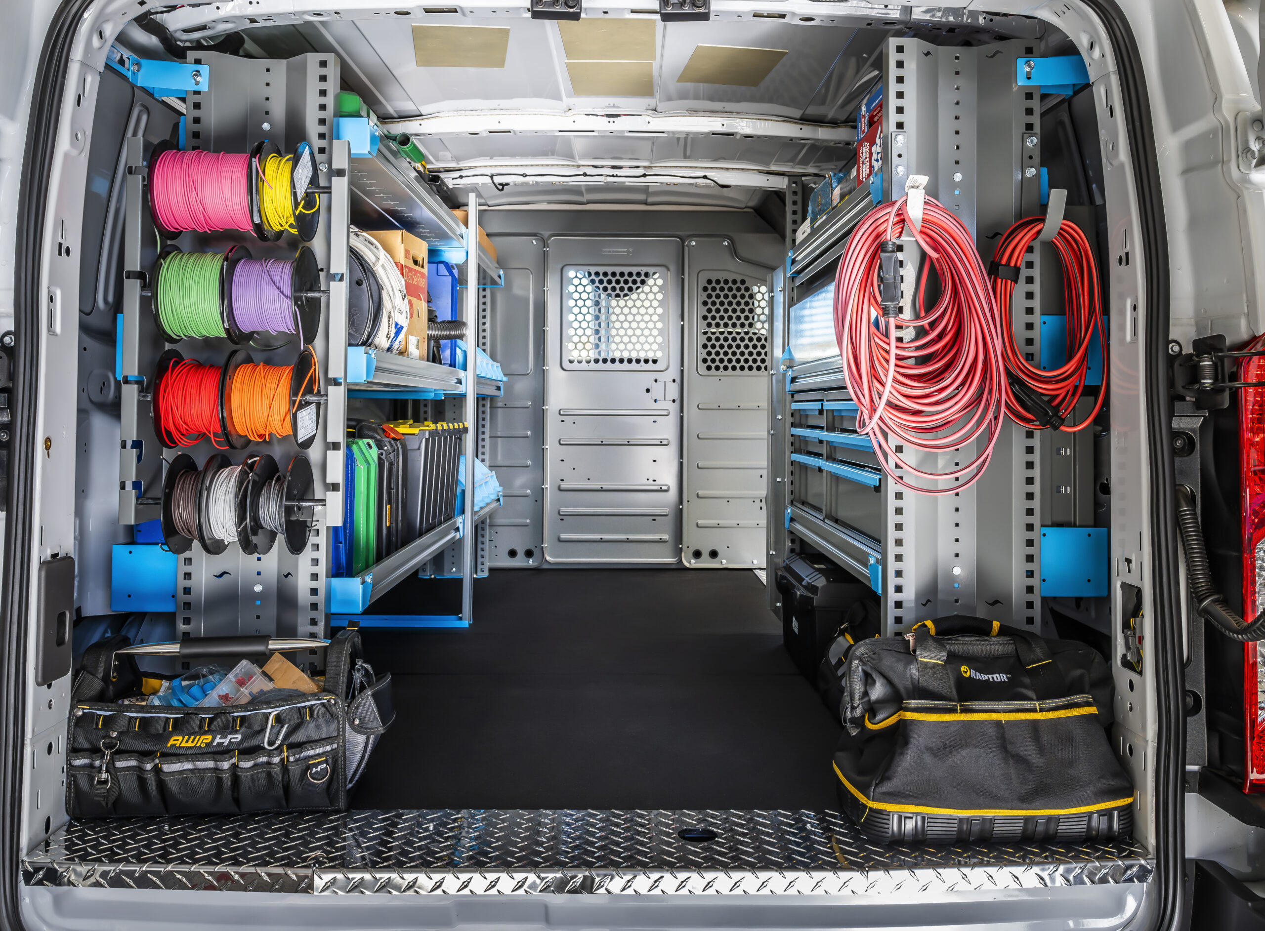 Keep your van organized and your work running smoothly with end panel storage spool holders. This rack mounts easily to partitions or end panels, providing a clean, space-saving way to store and dispense wire reels. Designed for professional trades on the go, it keeps supplies visible, accessible, and tangle-free—perfect for electricians, low-voltage installers, and HVAC technicians.
