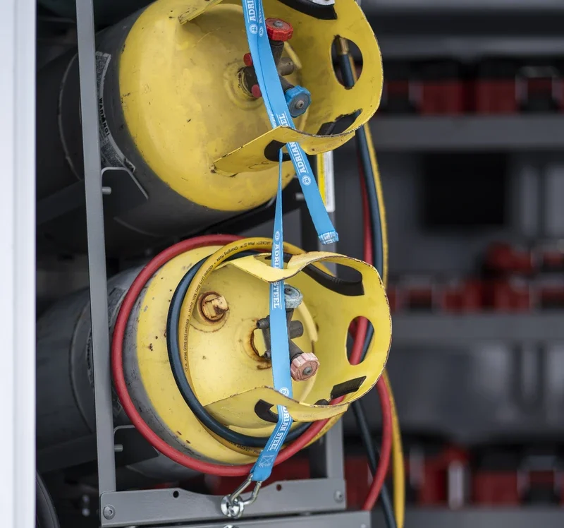By utilizing vertical storage, it frees up valuable floor space while securely holding tanks in place during transport. This setup not only creates a cleaner, more professional workspace but also speeds up access and workflow, making daily operations more efficient.