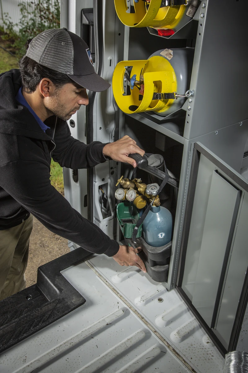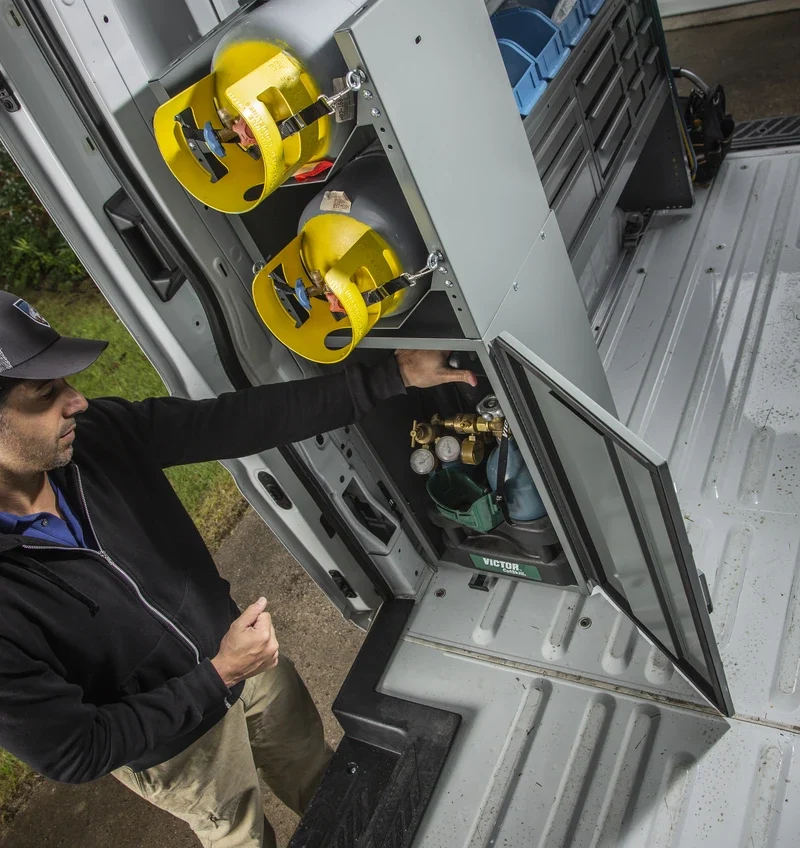 Keep your tanks safe and your van job-ready. This ventilated cabinet secures acetylene, oxygen, refrigerants, CO2 , or MAPP cylinders so nothing shifts on the road. Built-in vents send fumes outside, keeping the inside clear and reducing fire hazards. Strap in your tanks and go—safe, simple, and ready for the job.