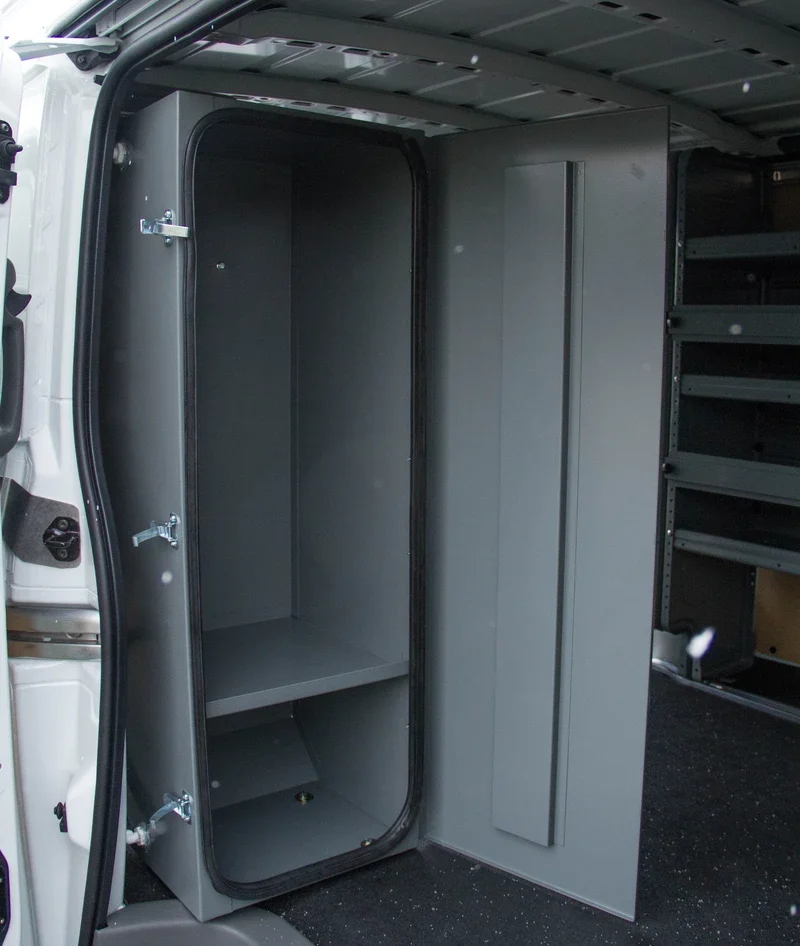 Vented cabinets in an upfitted vehicle are specialized storage enclosures designed to safely house chemicals, gas cylinders, batteries, or other materials that require ventilation. These cabinets have built-in vented panels that allow airflow to the exterior of the vehicle, helping to prevent the buildup of fumes, vapors, or heat inside the cabinet—an essential safety feature for mobile work environments.