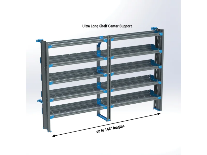 • Combine shelf lengths with center supports for continuous shelves up to 144”