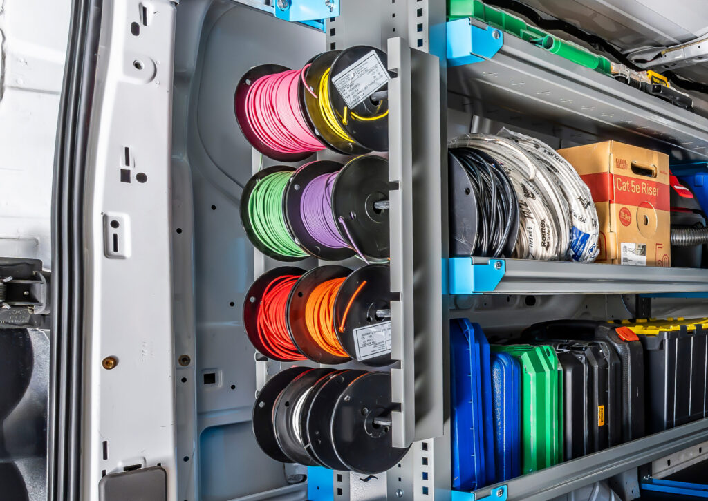 Keep cables and wire spools organized and tangle-free with our shelf-mounted spool holders. Available in single-bar and 3-bar options, they accommodate spools from 2″-6″ in diameter and mount easily to standard and next-gen truck shelving.